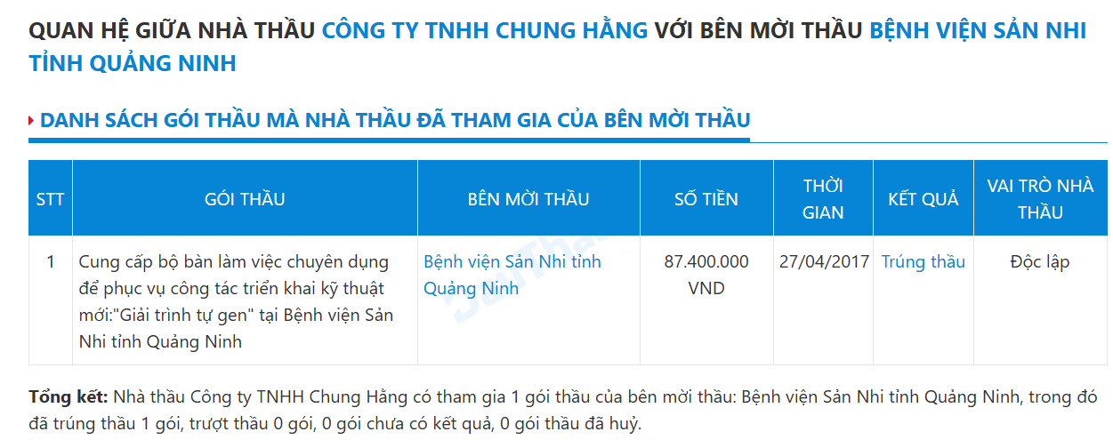 Quan hệ giữa nhà thầu Công ty TNHH Chung Hằng với bên mời thầu Bệnh viện Sản Nhi tỉnh Quảng Ninh